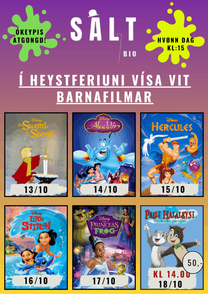 Í heystferiuni fara vit aftur í ár at vísa Disney teknifilmar:) Hvør filmur byrjar kl 15 og tiltakið er ókeypis!